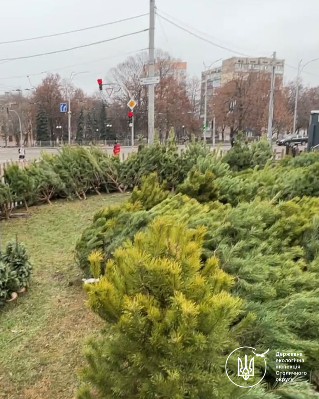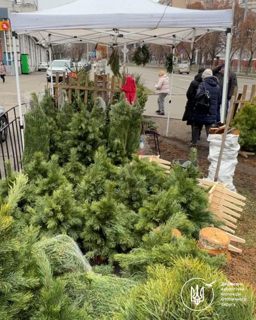 У ході огляду встановлено, що в Подільському районі столиці, на вул. Вишгородській (поблизу супермаркету «Сільпо»), організовано незаконну реалізацію хвойних дерев на території зеленої зони, що призвело до пошкодження газону площею близько 100 кв м. Також зафіксовано реалізацію новорічних ялинок без спеціальних самоклейних бірок, які підтверджують законність заготівлі, та відсутність документів, що засвідчують походження деревини.