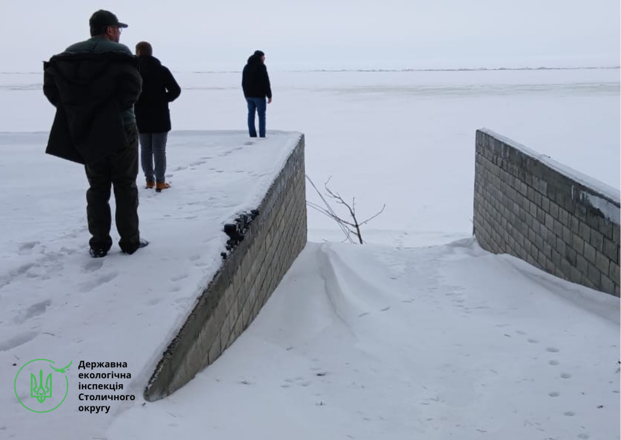 📌 У межах 100 метрів від урізу води проводяться будівельні роботи зі спорудження об’єктів невідомого функціонального призначення. Також виявлено пні зрізаних дерев. Окрім цього, на території проведено роботи з берегоукріплення Київського водосховища орієнтовною довжиною близько 200 метрів шляхом монтування бетонної підпірної стінки та бетонного спуску для плавзасобів (елінг).