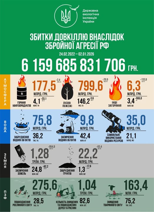 🗣 Оновлена щотижнева інфографіка про збитки, завдані довкіллю внаслідок збройної агресії рф 24.02.2022 - 02.01.2026